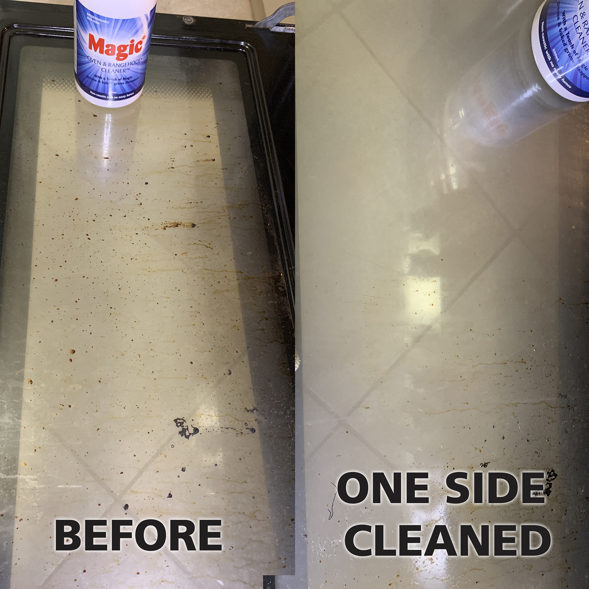 Many oven and rangehood cleaners are caustic and warn you to wear protective clothing and avoid inhaling the fumes. Magic Oven & Rangehood Cleaner is non-caustic, non-toxic and is tough on baked-on grease and spills.